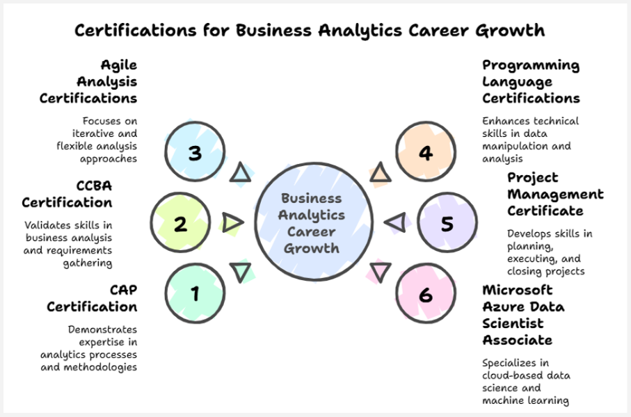 How do certifications support career growth in business analytics?
